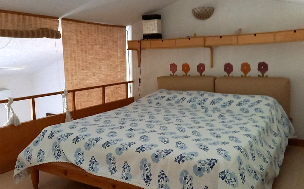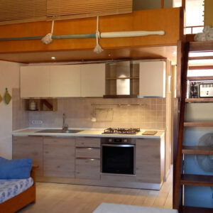 Composition: living room with kitchenette and double sofa bed, mezzanine with double bed, bathroom, niche with bunk bed, outdoor area equipped for eating outside.